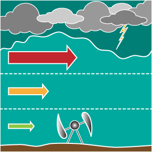 As the incoming wave is cancelled, the CycWEC produces shaft torque which is used by a generator to produce electricity. The blue arrows in the plot show the various velocities that approach the rotating hydrofoil. The passing waves cause a velocity in the radial direction (labeled "Wave"), which together with the rotational velocity of the hydrofoil ("Rotation") approach the foil. Due to this combined velocity, the hydrofoil produces lift. It can be seen that this lift force is angled in the direction of rotation (to the right), and the tangential component of the lift force ("Lt") creates a torque at the main shaft.