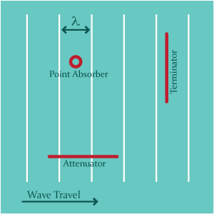 The figure on the left shows how wave energy can be extracted from a harmonic wave, which is shown in blue. The wave travels left-to-right, and if all of its energy has been absorbed, there would be no wave on the right side of the plot any more as shown in green. This is the stated goal of wave termination, and if achieved, the wave will end its travel at the wave energy converter, which is located in the center of the plot.